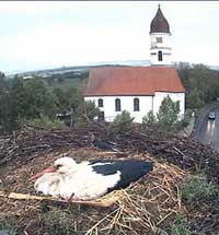 The fascination with on-line bird watching isn’t limited to North America. For example, there are a number of “stork” cameras in Europe, including one shown at the left in the Southwest German town of Gögglingen (visit web site. Note, there may be an ad). The site includes a link to a Google satellite view showing the exact location of the nest and the church seen in the background.