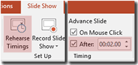 If your file has several slides, you can specify a different duration for each with the Advance Slide command on the right side of the Transitions ribbon, or the Rehearse Timings button on the Slide Show ribbon (Fig. 2). If individual slide timings are not needed, you can specify a global setting when you export the presentation (next step).