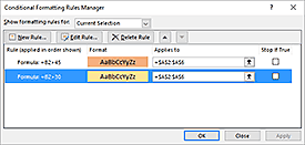 Rule priority is specified in the Conditional Formatting Rules Manager (See Figure 4). To make this setting, you first have to create the rules and apply them to the cells to be formatted. Then, select the cells to be formatted and choose Manage Rules from the bottom of the Conditional Formatting menu. All rules assigned to the selected cells are listed; those on top take precedence over those below. You can rearrange the list to create the desired hierarchy.